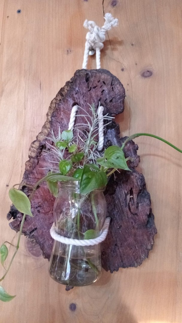 Hermosa rodaja de algarrobo intervenida con 1 frasco de vidrio y soga en diferentes tamaños